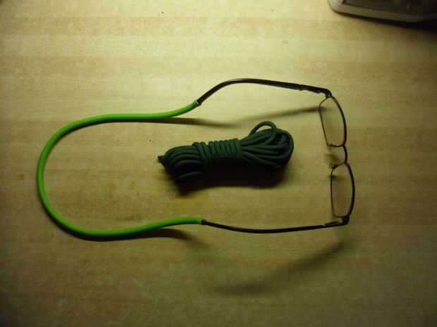 Usted necesitará un pedazo de 24 pulgadas de paracord y un pedazo de tubo de goma o algún otro tipo de material pequeño pero muy fuerte y elástico. Lo que he usado aquí es en realidad un tubo hecho de caer tus gafas de sol. La tengo a la venta en mi local de Wal Mart tienda por 2 dólares. Es muy fuerte y puede estirar al doble de su longitud relajada. Perfecto. He escuchado que se llama tubería quirúrgica también. Usted también necesitará un pedazo de cuero de 1 pulgada de ancho y 3 pulgadas de largo.