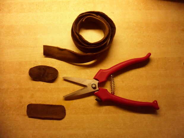 El pedazo de cuero tendrá un agujero en cada extremo sólo lo suficientemente grande como para pasar el tubo. Sólo utiliza un cuchillo del exacto para cortar los orificios de 3/16" de diámetro y estaba seguro de dejar al menos 1/4" entre el agujero y el extremo de la piel.
