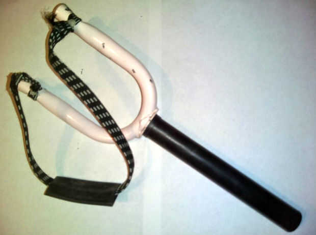 - Una pieza de la correa del equipaje lo usamos para la eslinga del uno mismo, con funciona bastante bien, siendo una banda elástica fuerte. (Tan bien tiro una piedra por lo menos 30 metros de distancia, fuera de mi jardín, casi en una concurrida carretera. Allí va a ser un buen ejemplo para mis hijos...)