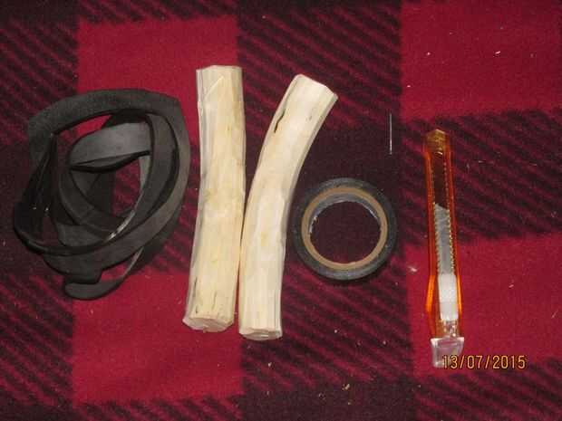Para hacer esto, usted necesitará: dos piezas de madera *, una buena longitud del tubo interno de moto/coche, un cuchillo y opcionalmente algunos cinta aislante (el tirachinas funcionará bien sin la cinta.)