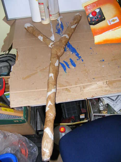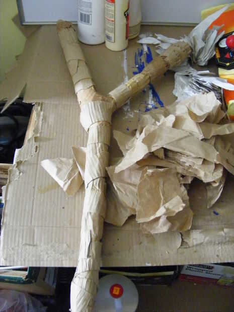 Comience envolviendo y pegando las tiras de cartón corrugado. Puede ligeramente ángulo del abrigo y apriete hacia abajo para compactar el papel maché. Todo esto se agrega el carácter de la rama"madera" cuando se seque el pegamento.