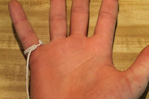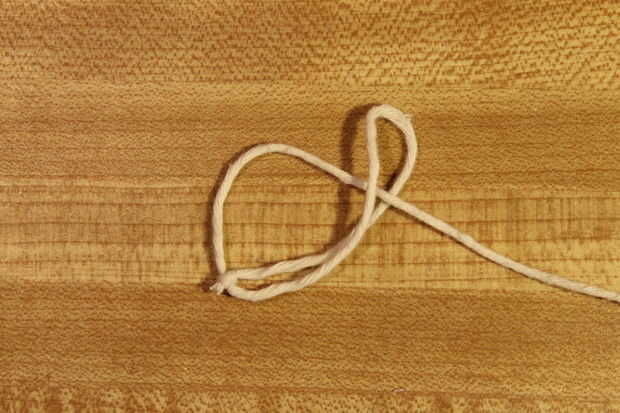 Luego, cortar un trozo de 40cm de cadena (o línea de pesca si queremos ser invisibles) y crear un nudo ajustable (puede utilizar las imágenes como guía).