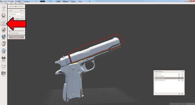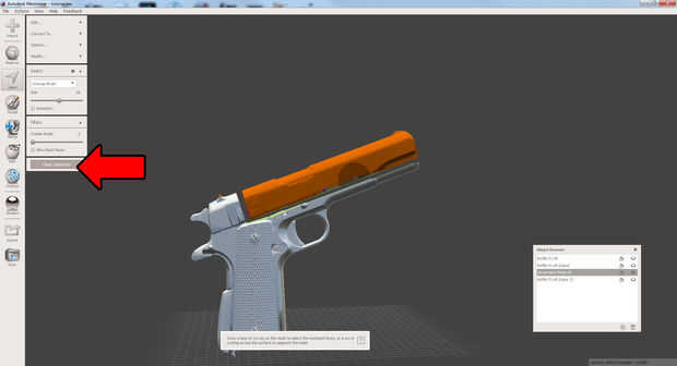 De la cinta de opciones, elija la herramienta seleccionar y trace una línea alrededor de la parte superior del cañón de pistola cortado, el área seleccionada se pondrá naranja. Después usted puede hacer clic en Borrar selección que borra el área seleccionada.