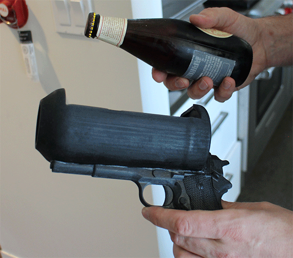 Inserción de la botella puede ser un poco apretado, dependiendo de cómo pequeñas su sostenedor de botella es comparado con la botella que decide cargar en su pistola. Los bordes inferiores del labio y la parte superior del titular de la botella pueden ser refinados con un papel de lija para permitir más fácil botella carga si es necesario.