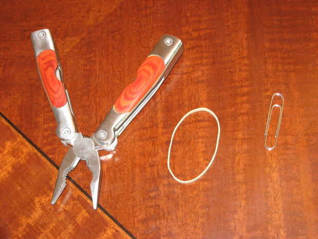 primero tiene que 2 pares de alicates (puede usar uno pero es easer para utilizar 2), una banda de caucho y un clip de papel (los grandes funcionan mejor.