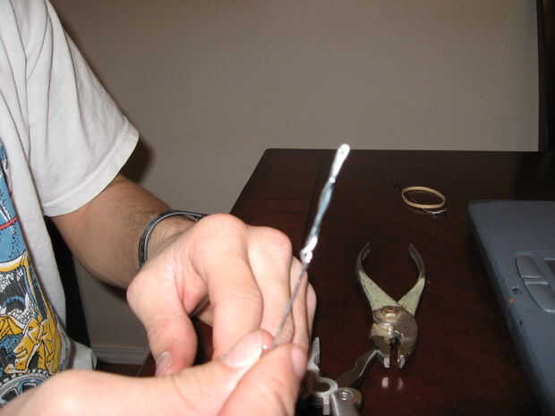 este wiil disparar shishkabob brochetas con 3 capas de cartón y en puertas de madera! Muy sencillo y potente banda de caucho solo 2 partes y cuaderno de papel / mauly clip. No disparar a personas o animales!Paso 1: Paso 1 Envuelva la banda de goma al