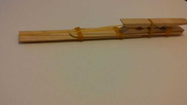 Abrir la pinza para la ropa y poner una parte de una banda de goma interior. Luego, cerrarlo y estirar la goma al palo cortado. (Ver imagen)