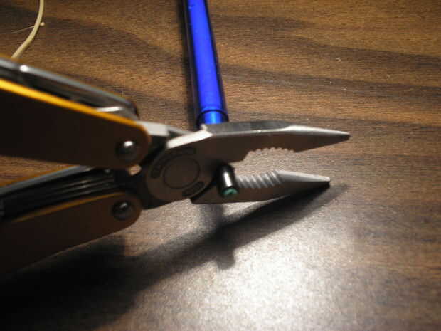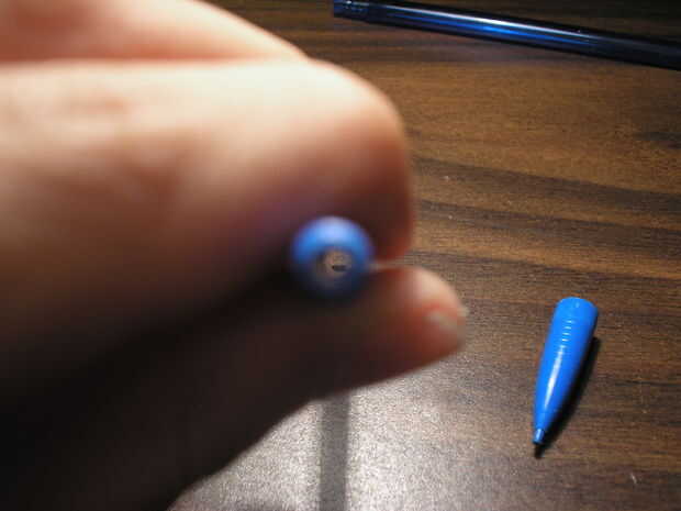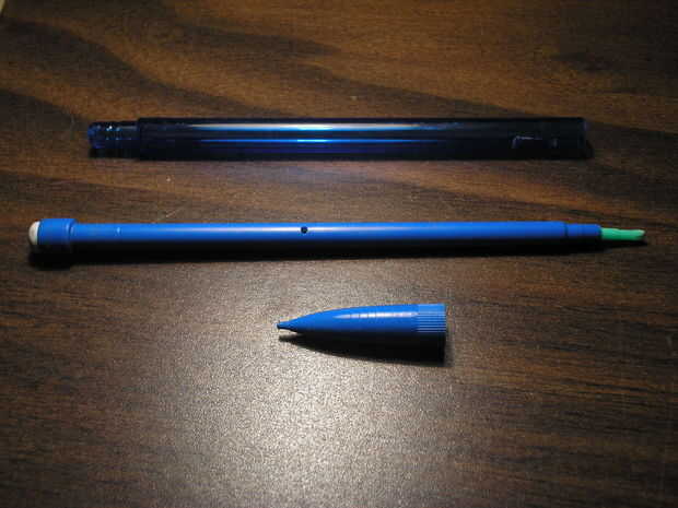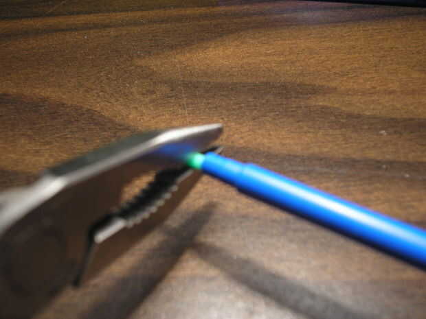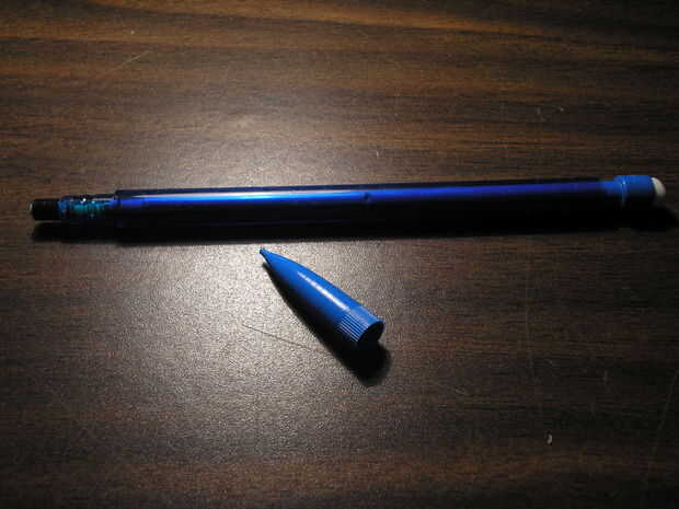 Primero que desea quitar la punta de su lápiz mecánico. Pude a sacar minas con mis manos, pero puede que necesite sus pinzas para ello. Algunos también desenroscar. Apartar la punta. Una vez que tengas la punta quitada, presione hacia abajo el borrador, como para alimentar a plomo a través de la herramienta. Donde estaba la punta, veremos al final salir. Encontrar el tubo estrecho (verde en la imagen) y cortar con la multiherramienta. Tenga cuidado, pedazos se van volando. Debe separar en 3 partes principales, el tubo interno, tubo externo y el resorte. No necesita la primavera para este proyecto. Tomar el tubo interior. Con sus pinzas, doble el tubo estrecho restante (parte verde) cerca del borde hasta que se rompe. Quitar la goma de borrar y dejar que la otra parte caerá. El tubo interior debe quedar hueco.
