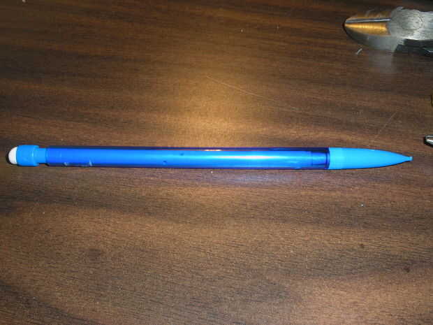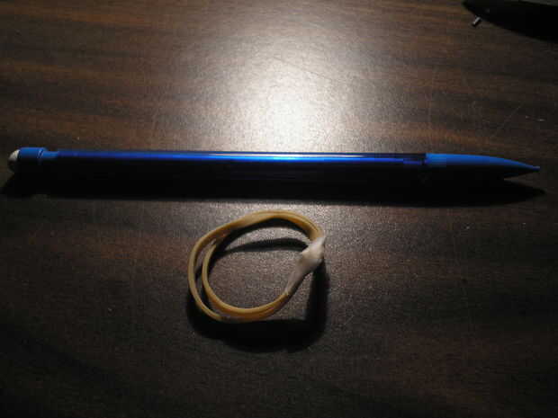 a continuación, doblar el clip, por lo que es recto. Quiere que sea un derecho como sea posible, pues probar y salir todos los kinks en él. Asegúrese de que desliza fácilmente a través del cañón (lápiz). Luego, tomar sus cortadores de alambre y cortar el clip para que quepa completamente dentro del lápiz (con la punta y borrador en). Al cortarlo, debe conseguir sharp. Si no, corta en un ángulo. Coloque el clip dentro de la herramienta y vuelva a colocar la punta y borrador del lápiz. Doble banda de goma elástica. Tome un pedazo de cinta scotch y Envuélvala alrededor de la goma. Esto protege la goma y hace más fácil rodar el clip de papel.