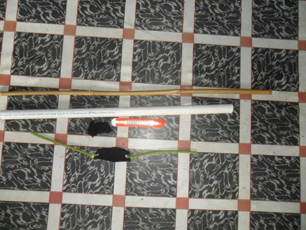Para esta build necesita algún medio "a 1" pieza de pvc, una longitud de bambú seco, alguna cadena o lana, una configuración de banda y bolsa de tirachinas, una sierra de mano (no mostrado aquí) y un cuchillo.