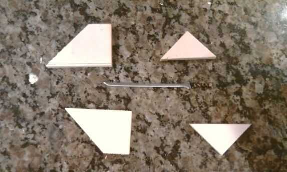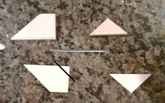 3. dejar esto de lado y tomó la longitud más corta de álamo y sacó algunas figuras geométricas a usar para la base de la hoja y el mango y cortar con una sierra de marquetería. Que coloca la pieza en los lados de la longitud más larga de álamo y encontré que sólo no mira a la derecha. Corté un pedazo de la esquina de uno de los polígonos para conseguir la forma que quería (se guarda esta pieza).