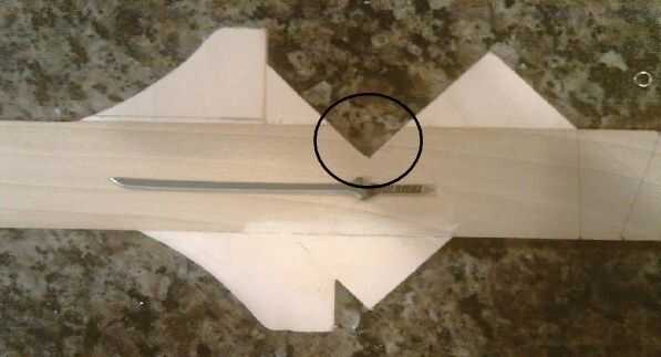 4. pegué las piezas en su lugar.  Teniendo en cuenta la forma de la tuba de espadas (protector de empuñadura) usé el pequeño triángulo que había cortado de uno de los polígonos.  He hecho una muesca en la Tsuba (empuñadura), otra vez para mantener fiel a la forma.