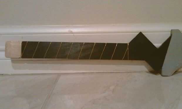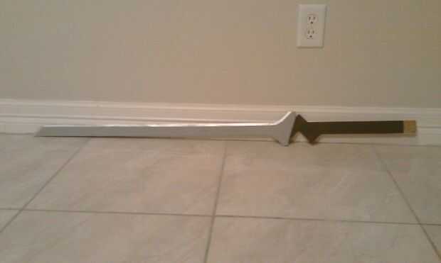 8. aerosol pintado plata Yaiba (filo) y deje que se seque. Entonces ponga cinta de pintor sobre esto y había pintado el gris de Ken (hoja) y deje secar. Colocar cinta de pintor sobre el área que sería el Tsuba (empuñadura). Pinté la kashira (pomo) oro déjelo secar y lo cubrió con cinta de pintor. Luego había pintada de negro la Tsuka (mango) y deje que se seque. Me quité la cinta de pintores.