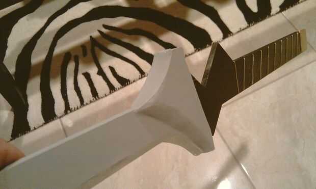 10. no me gustó cómo débil mi producto final parecía hecho 2 trazos de la parte inferior del ken (hoja) en un trozo de álamo (3 x ¼ pulg.) y esta cortado con mi sierra de marquetería.  Tallado y lijar las dos piezas que se funden en el Ken y había pintado gris. Pegué a la parte inferior del Ken y esto agregado a granel que hicieron la espada robusta
