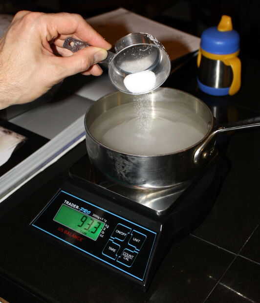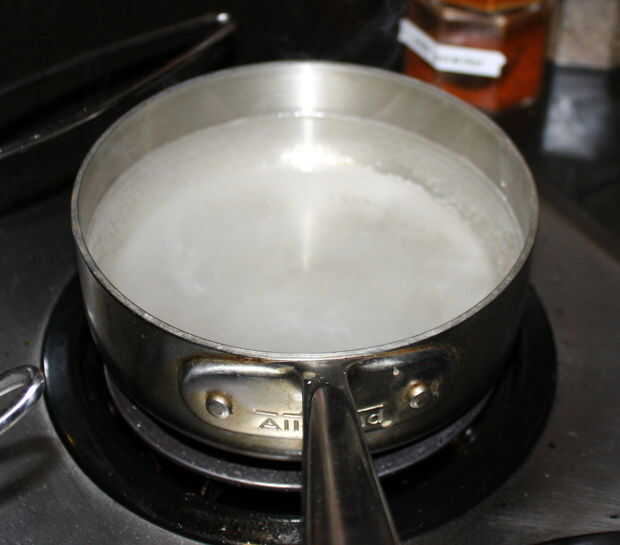 Mezclar el agua, azúcar y sal en recipiente pequeño (1 cuarto) y poner a hervir, revolviendo para disolver el azúcar y la sal.