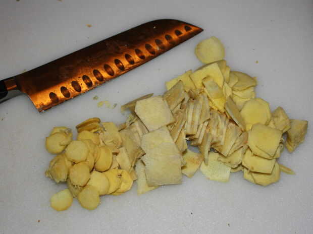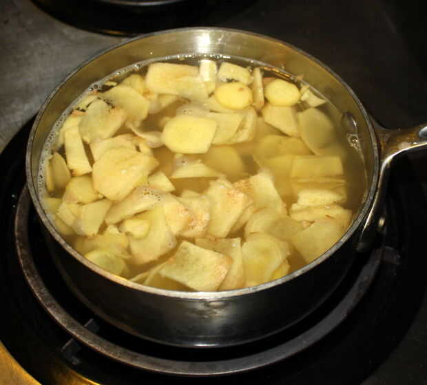 Añadir el jengibre, revolver, luego apague y deje que el jengibre empapar por 10 minutos.