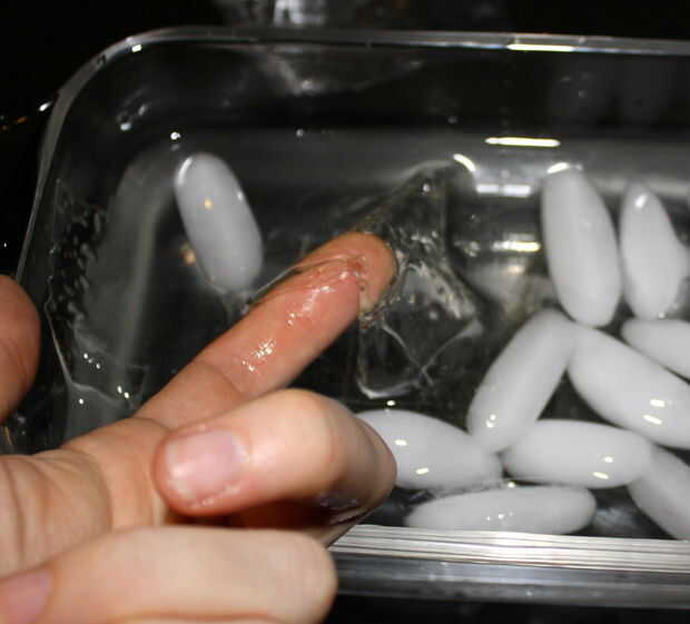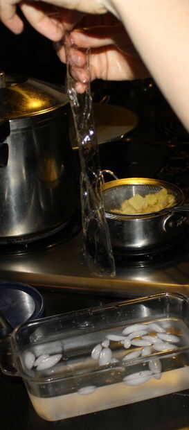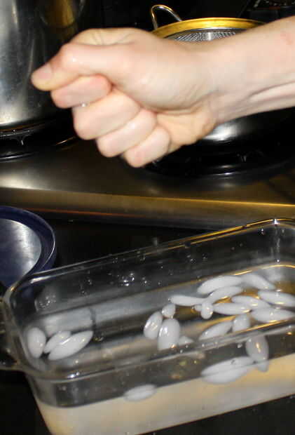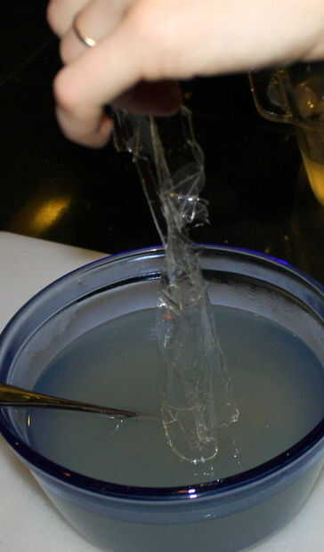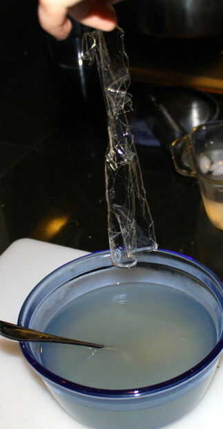 Tomar 4 hojas de gelatina en agua con hielo hasta que se ablanden completamente, unos 5 minutos.