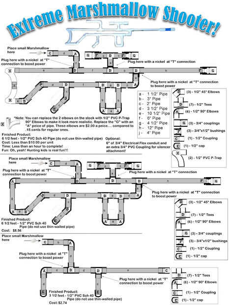 he trabajado en el Museo de Ciencias naturales este verano y quería pasar un buen rato con mis alumnos. Busqué en línea y encontrar tiradores de malvavisco, específicamente en este sitio. Me gustaron los diseños, pero sentía que los niños se aburren y yo quería que la fabricación de las armas y después de "guerra" para ser realmente entretenido y tomar un par de días... así que me senté e inventó un rifle de cualquier niño le encantaría. Adjunta es lo que finalmente surgió, junto con las versiones más simples y más baratas. El último es lo que encontré en este sitio. En cuanto a cómo utilizar... Como dije la mayoría de los niños he trabajado con... Es como intentar conseguir un cabello de la punta de su lengua sin usar las manos, o tocando una trompeta... Pruebalo y lanzará mini malvaviscos por lo menos 100 pies con este rifle.