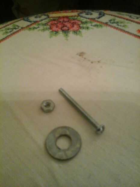 1. necesitará un tornillo con una tuerca que tiene una cabeza plana. la cabeza debe ser lo suficientemente grande para adhear masilla a o puede Agregar una arandela.