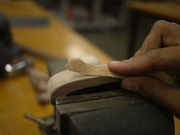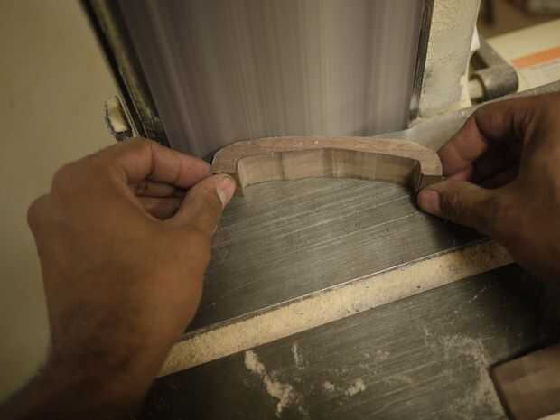 Comencé a lijar las asas de la lijadora de banda de pie. Esto funcionó bien, pero desde esta lijadora es con papel de grano 60 y se mueve muy rápido, fue quitando demasiada madera demasiado rápido, además de dejaba las líneas profundas en la superficie (ver primer plano imagen 2).