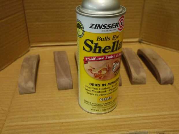 Para terminar los mangos comenzó con una laca de spray para sellar la superficie, luego cambia a un barniz spray satinado. Rociado en una cabina de aerosol de improvisados de una caja de cartón. Después de rociar 1 capa de goma laca por todos lados y 3 capas de laca, me frota con lana de acero 0000 #.