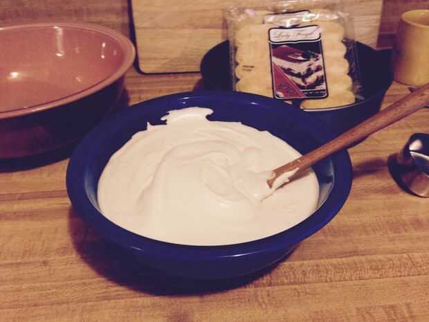 2. Capa de la parte inferior de su bandeja con los dedos de la señora; luego use una cuchara grande para extender encima una capa de Mousse de Mascarpone