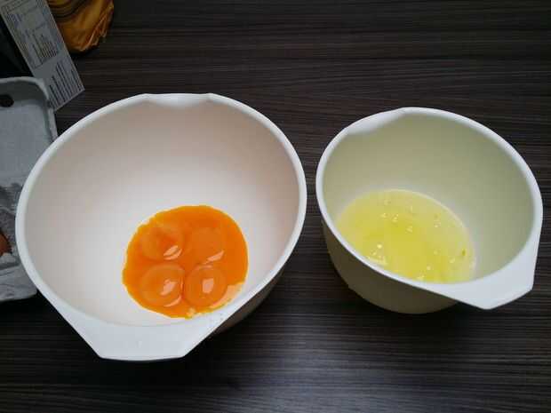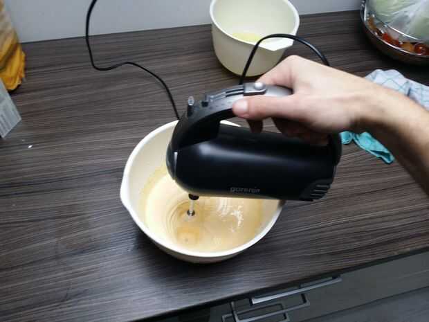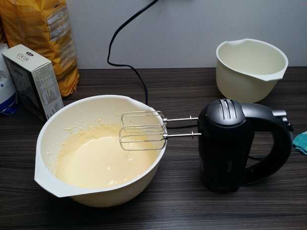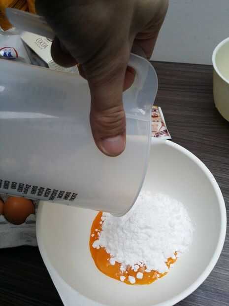 2.) en un tazón poner 5 yemas de huevo, 100 g de azúcar impalpable y azúcar Ron. Todo se mezcla con una batidora, hasta obtener una masa densa amarillo.