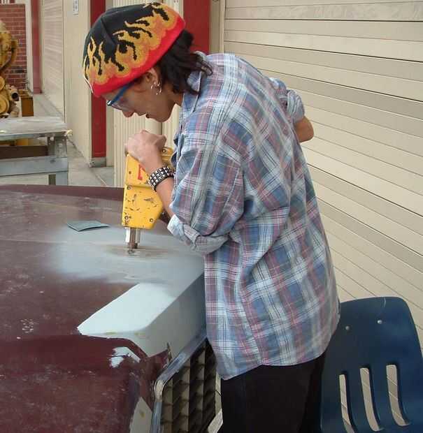 5. operación de la soldadora de perno prisionero: una vez que tienes una viga en el titular del stud Coloque cuidadosamente la soldadora de perno prisionero contra la superficie que se desea soldar con autógena el perno a. El anillo de cobre generalmente es primavera tan cargado, presione firmemente. Asegúrese de que el anillo de contacto está en contacto con la superficie y luego presione el gatillo durante NO más de 4 segundos!!!!!! (Si pulsas el gatillo, le puede el riesgo de quemar un agujero a través del metal).
