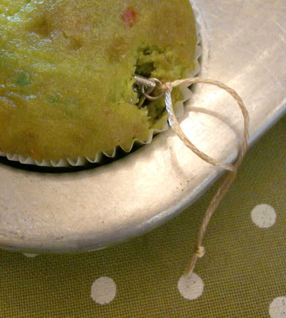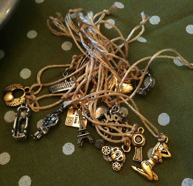 Utilicé hilo/hilo de bordar y atado a un lazo largo en cada encanto, elegí un color oro para las cadenas porque mis colores eran oro y rosa. Además, con cupcakes, cintas más sería demasiado gruesas. Cintas se vería increíbles, pero cuando estás haciendo alrededor de 20,... son eficaces. ;)