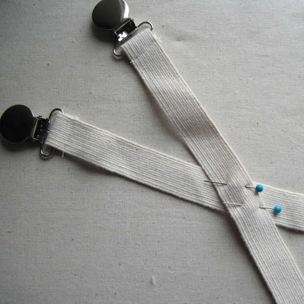 Paso 4: cruzar las piezas elásticas y pin en su lugar, asegúrese de que son incluso y coser en forma de diamante para mantenerlos juntos