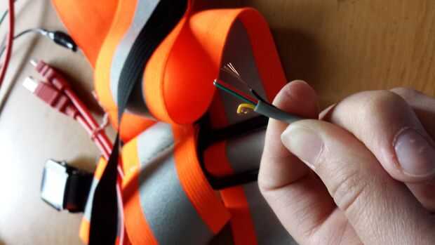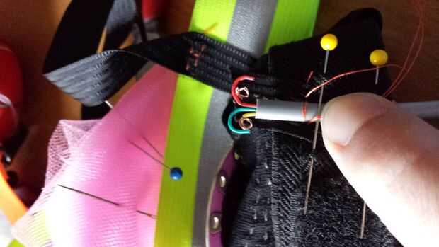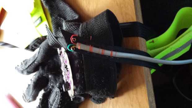 En la parte superior final del guante, costura o soldadura (+), cables de datos pin y líneas (-) al teléfono.