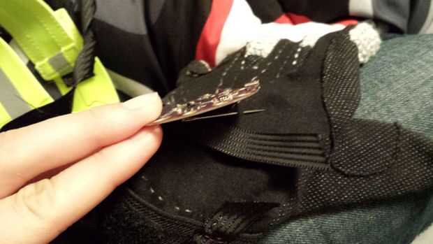 Algo me derribó sobre cómo superar el (-) para mi pulgar... pero se dio cuenta de que sólo podía enganchar algún alambre de la cinta sobrante! Anclado el pin y me cosió una línea conductora a la vez.