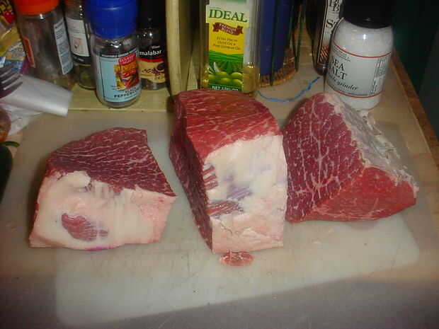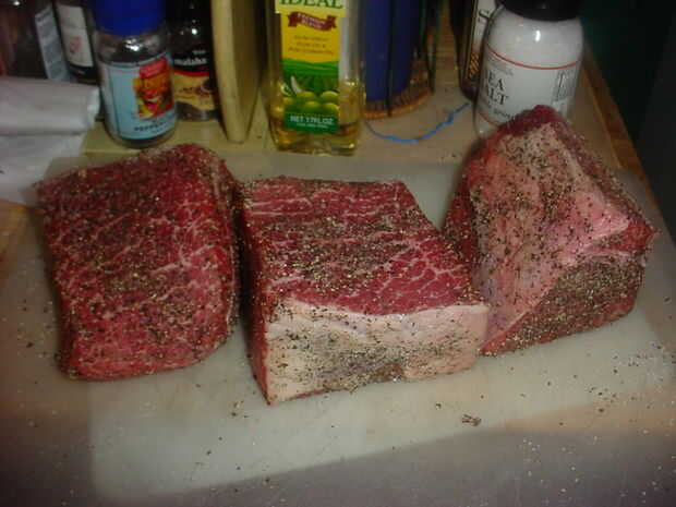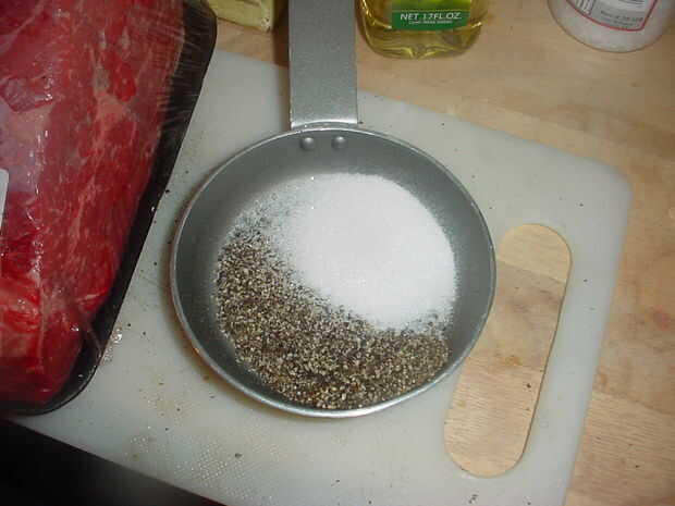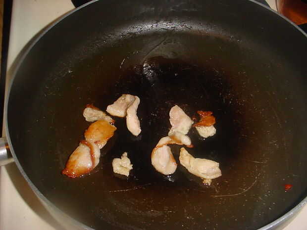 Quitar el resto de bits a la izquierda de la prestación de la grasa (estos hacen gran perro golosinas) a su vez el calor a alta med y coloque los trozos de carne en la sartén, la parte grasa hacia abajo para comenzar. Deje que se llenarán de 3-4 minutos hasta que se doren luego girar los trozos, queremos dorar todos los lados