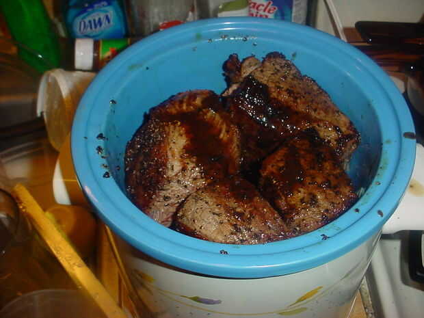 Una vez que sus trozos de carne estén bien dorados, que encajen en la olla encima de los pimientos y la cebolla, Desglasar la sartén con una taza de 1/4 de agua (o vino si tienes algunos) Añadir una 1/4 taza de salsa para bistec y unos toques de salsa de worcheshire, mezcle bien y vierta sobre la carne. Baje el calor a la olla de abajo y coloque la tapa en... a pie de 10-12 horas