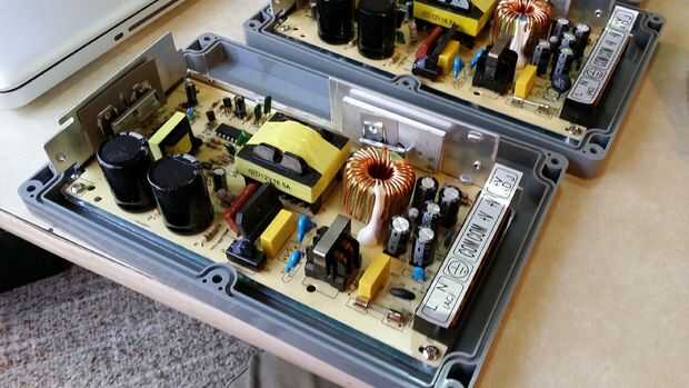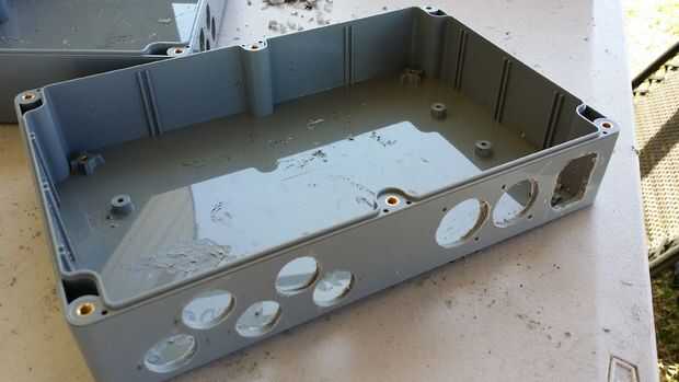 Opté por usar una caja de jiffy de Jaycar. Encontré uno que sólo se ajusta la fuente de alimentación. Esto significaba que tenía que quitar la jaula de malla y corte cierto exceso de la fuente de alimentación para adaptarse a la otra electrónica. Me quitan la placa entera de la fuente de alimentación antes de cualquier corte. Usted no quiere así que aseguran de limaduras metálicas en el adaptador de red cuando se enciende se todos limpian lejos antes todos detrás juntos. Quité lo menos posible ya que es utilizado como un disipador térmico.