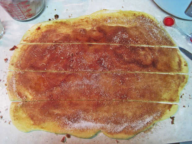 8. utilizando un cortador de pizza, rebanada de la masa en tiras de 3-4 pulgadas.