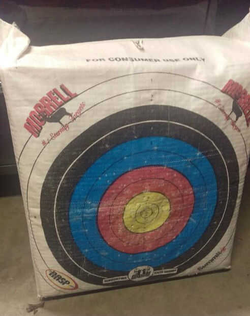 este es mi objetivo de tiro con arco casero, se hace fuera de un colchón viejo de espuma, pino tratado, alambre de pollo y una especie de cartón plástico. El objetivo es de 1m cuadrado, usar un arco de 55 libras y las flechas están paradas cerca de 5