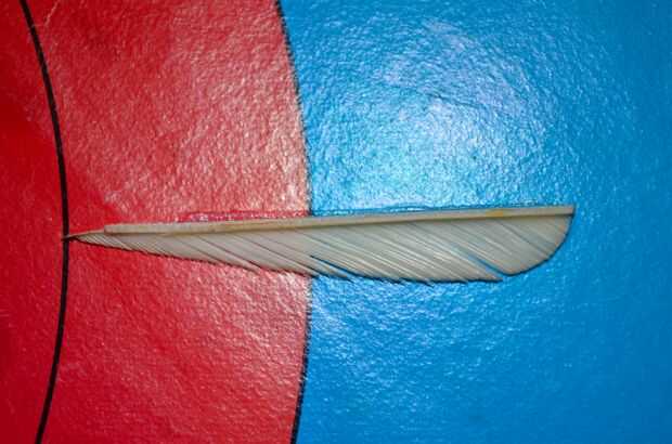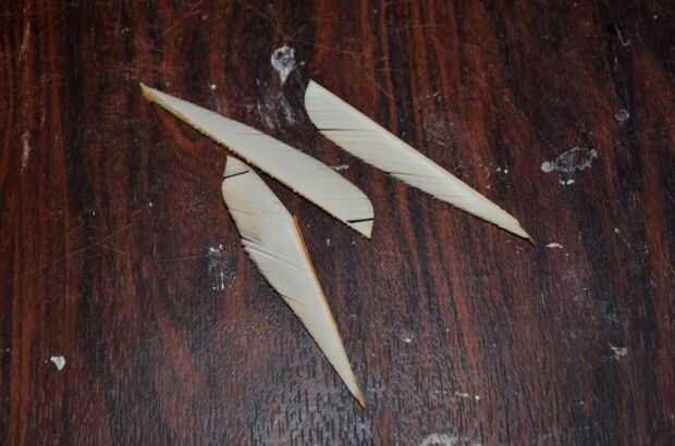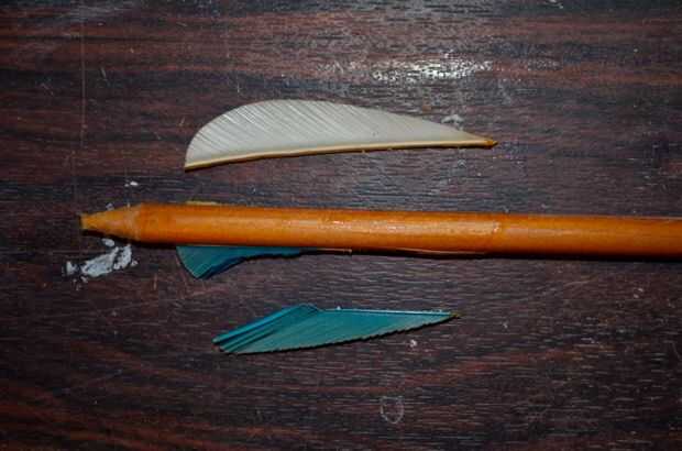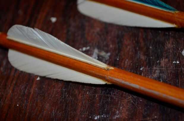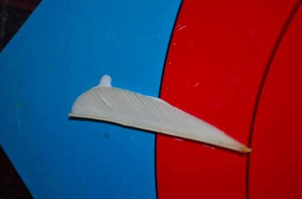 Algunas plumas tienen una gran base donde está pegados a la flecha. Puede que necesite diseccionarlos para que sean capaz de pegamento-abajo. Mina eran aceptable en un borde, pero no el otro así que había pegado abajo con el lado bueno hacia abajo.