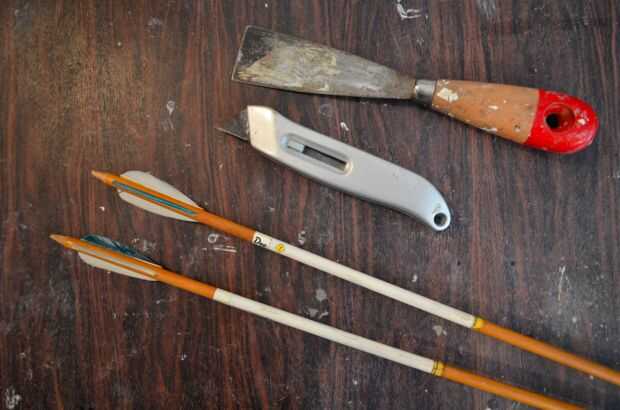 Si ha roto las flechas, usted necesitará bajar las plumas. Cuidadosamente con un cuchillo Retire cualquier visibles manchas de pegamento, luego cortar lentamente y hacer palanca las plumas de. Un raspador de pintura / espátula también puede ser útil para este paso. Tenga cuidado de no levantar la madera de la flecha así como es muy difícil salir. Como las flechas que utilizan eran bastante viejas, tenían plumas pluma real. Los más modernos se hacen generalmente de plástico.