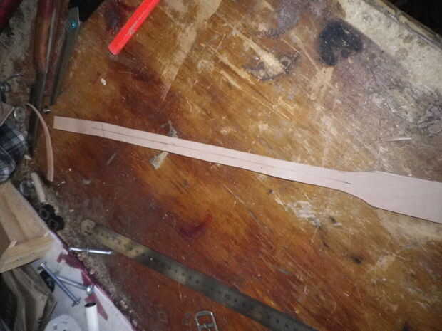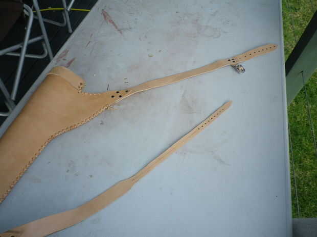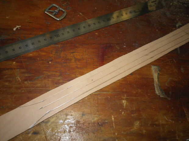 Porque las correas ya habían sido cortadas a la misma anchura y Unidas a la aljaba la correa debajo de las axilas debe ser reducido. El centro de la correa fue marcado por el tiempo necesario para ser estrecho (aprox. 350mm). Luego líneas paralelas marcadas 9mm a cada lado de la línea central (para el tamaño de la hebilla a utilizarse). Las curvas fueron dibujadas entonces en evitar hacer esquinas cuadradas (cuadro 2 este paso). La correa fue recortar con tijeras. El extremo de la correa fue señalado y agujeros fueron perforados a intervalos de 10mm para permitir que la punta de la hebilla recorrer.