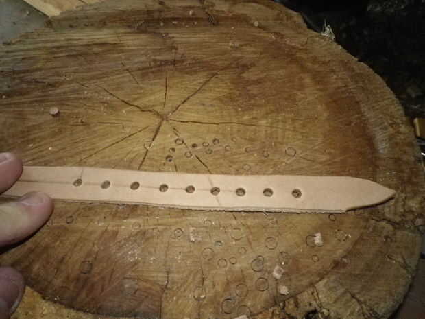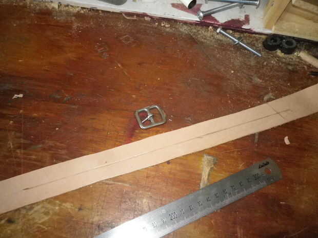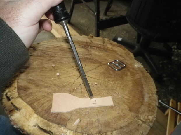 Para habilitar la correa debajo del brazo ser conectado a la correa principal una especie de mini correa hizo y atada a la correa principal perpendicular a la correa principal. Esta correa poco fue 90mm de largo antes de que la hebilla fue unida. Cuadro 5 (este paso) muestra el uso de un cincel de carpinteros de 12mm para cortar el agujero para la clavija de la hebilla. La mini correa fue colocada en la parte inferior de la correa principal con tres remaches.