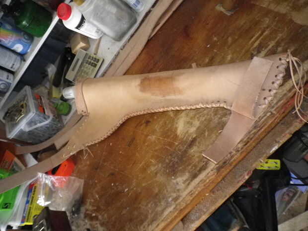 Sin embargo, una perforadora y un martillo se utilizaron en un bloque de madera para perforar los agujeros de los cordones. La aljaba era doblada por la mitad y sujeta por tres abrazaderas de resorte pequeño (ferretería) y agujeros fueron perforados cada 15mm (las distancias no se midieron sólo estimadas). Era importante para mantener los agujeros incluso una posible y también la misma distancia desde el borde (aprox. 10mm). Ir poco a poco como una vez que se perfora un agujero no se puede cambiar.