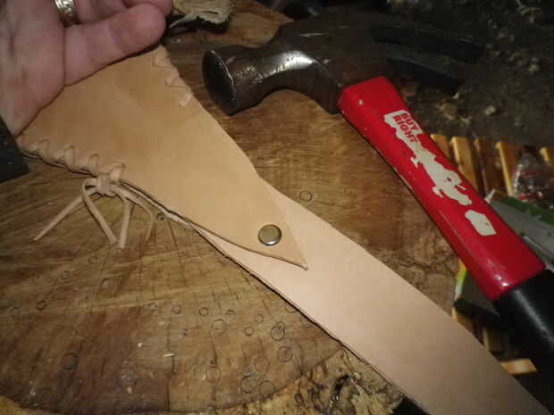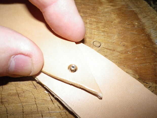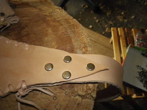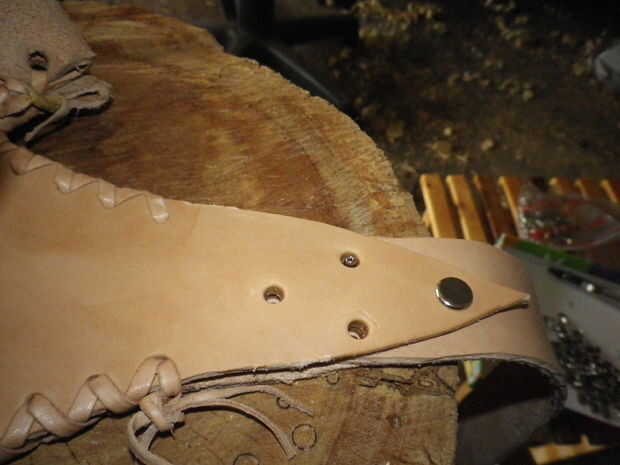 Un remache de cuero (2 parte) era a través del orificio y martillado Inicio. El resto de los remaches fueron Unidos en forma de diamante para hacer la Unión más segura en caso de que un remache vino aparte y para repartir la carga sobre la piel.