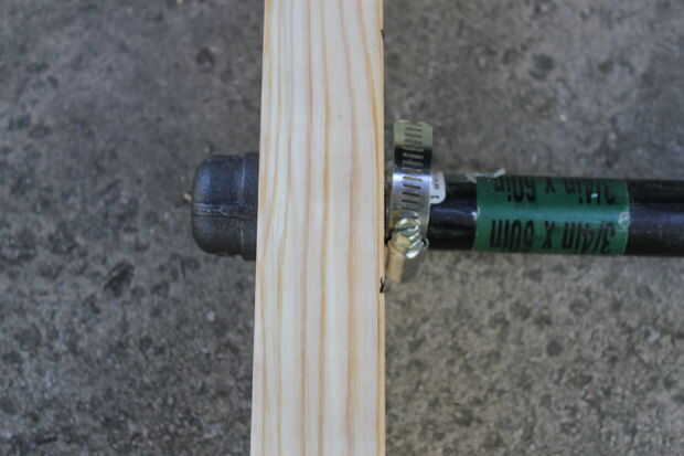 Poner libremente sus abrazaderas de manguera en el tubo unas pocas pulgadas del extremo. pasar el tubo a través del orificio perforado en el vertical y el tornillo de la tapa del extremo. A continuación apriete la abrazadera de la manguera hasta el otro lado de la estructura vertical y apriete en su lugar. La tapa mantendrá el tubo caiga fuera del vertical y la abrazadera de manguera evitará el vertical deslizando hacia el centro de la tubería.