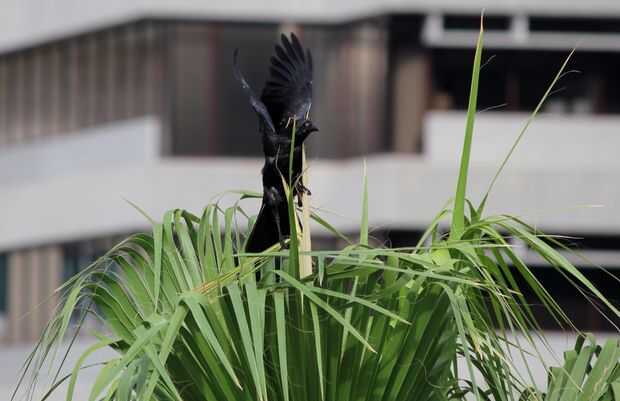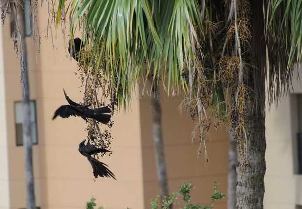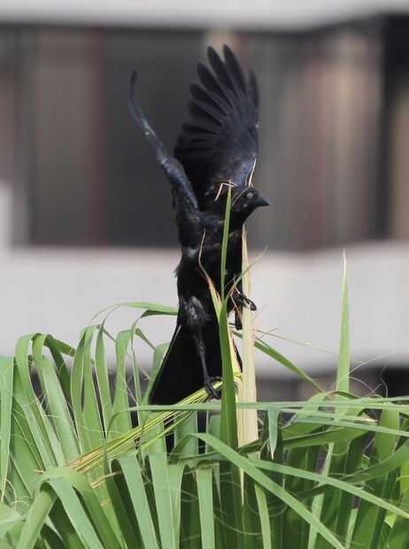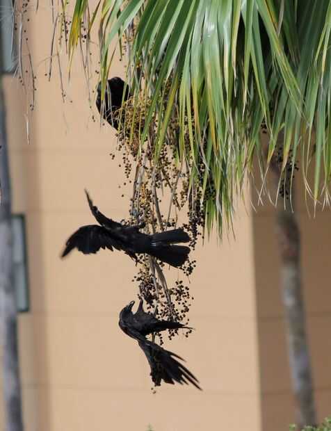 Los pájaros colgando todos los filamentos de las semillas para que gran oportunidad de capturar en diferentes poses, y me ha gustado especialmente una de ellas cuelgan como adornos una. Pero el pájaro en la parte superior de la palma, las alas hacia arriba, también una imagen llamativa. Dos de esos disparos fueron cosechados más de cerca en edición de fotos, para mejor resaltar los aspectos de las imágenes que me ha gustado más, como fue el cierre toma del cuervo graznido, recortado a partir de una imagen de cuerpo completa.