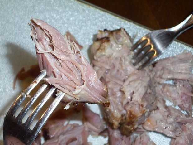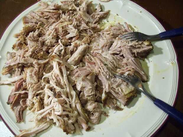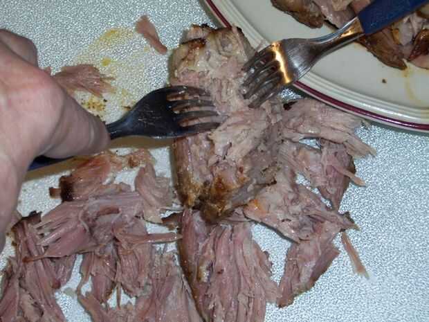 En este punto usted puede eligió a separe la carne de cerdo con 2 tenedores o con las manos. Incluso puede picar la carne en pequeñas porciones con un cuchillo. De cualquier manera, lo primero que tienes que hacer a continuación es eliminar gran parte de la grasa que está en un lado de la carne. La carne es tan tierna que separará fácilmente en tus manos en el más mínimo toque. Las áreas que la carne tenderá a querer separar de sí mismo o como algunas personas lo describen, deshacerse en sus manos, son donde se encuentran los músculos. Cualquier otros depósitos de grasa que quedan estarán en la zona donde la carne es más susceptible a venir aparte. Eliminación de esta grasa con las manos debe ser su próximo curso de acción. Ahora estás listo para tirar o cortar Su trasero de cerdo.