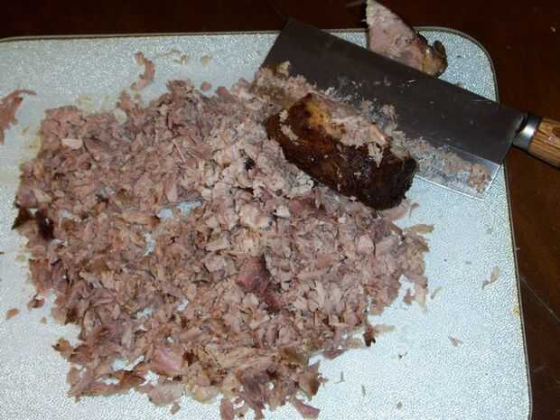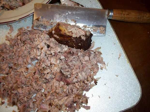 Asado de cerdo, lento cocinado con vino de Borgoña, caldo de carne, salsa de soja, jengibre y tomillo. La carne de cerdo es luego triturado y comido el pan de sándwich con salsa BBQ.Ingredientes:1 Paletilla de cerdo (el más grande que usted puede enc