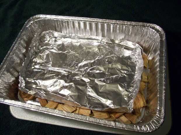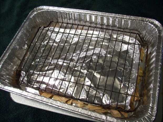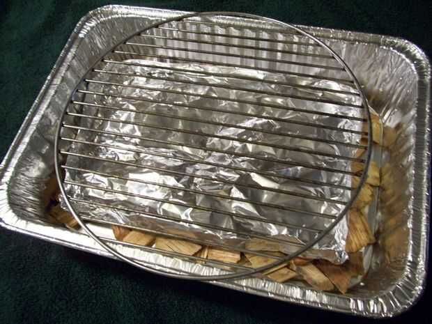 2.) A poco pan un poco más pequeño que la bandeja principal. Este pan se sientan sobre las virutas de madera y ser una cacerola de goteo para recoger los jugos grasa.