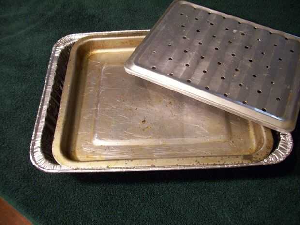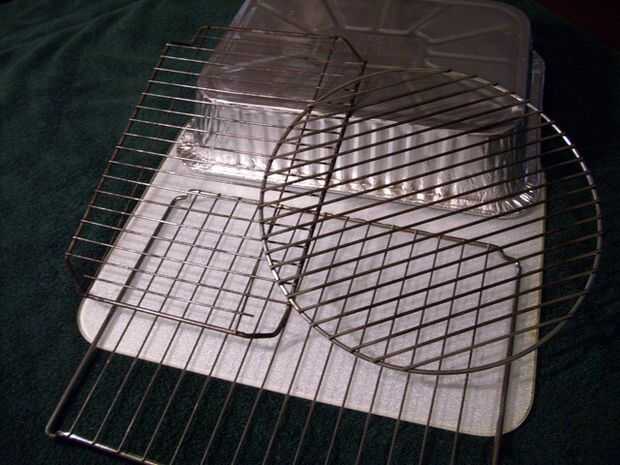 Para la bandeja principal más grande puede encontrar las bandejas de aluminio desechables en la mayoría de las tiendas aquí en los Estados. Las bandejas de asado Turquía trabajará aunque son más grandes que usted realmente necesita. En la misma zona que la asación cacerolas generalmente puede encontrar utensilios más pequeños que pueden ser utilizados para la grasera. Racks de pequeñas branquias funcionan bien para apoyar la carne. Incluso he utilizado las estanterías metálicas de hornos tostadores.