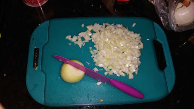 Picar las cebollas y pimientos, sin necesidad de ser perfecto. La variedad de tamaños a añadir diferentes texturas.